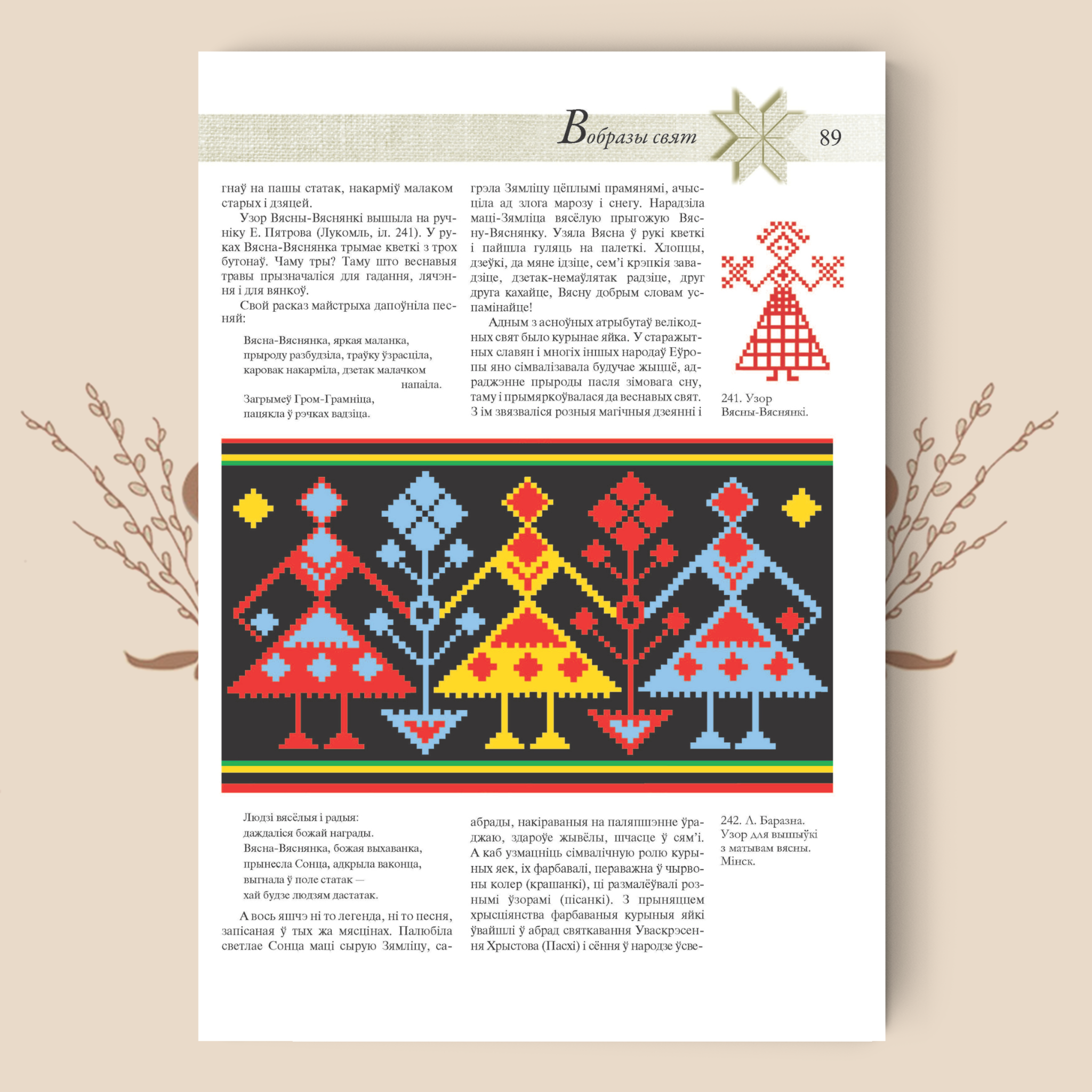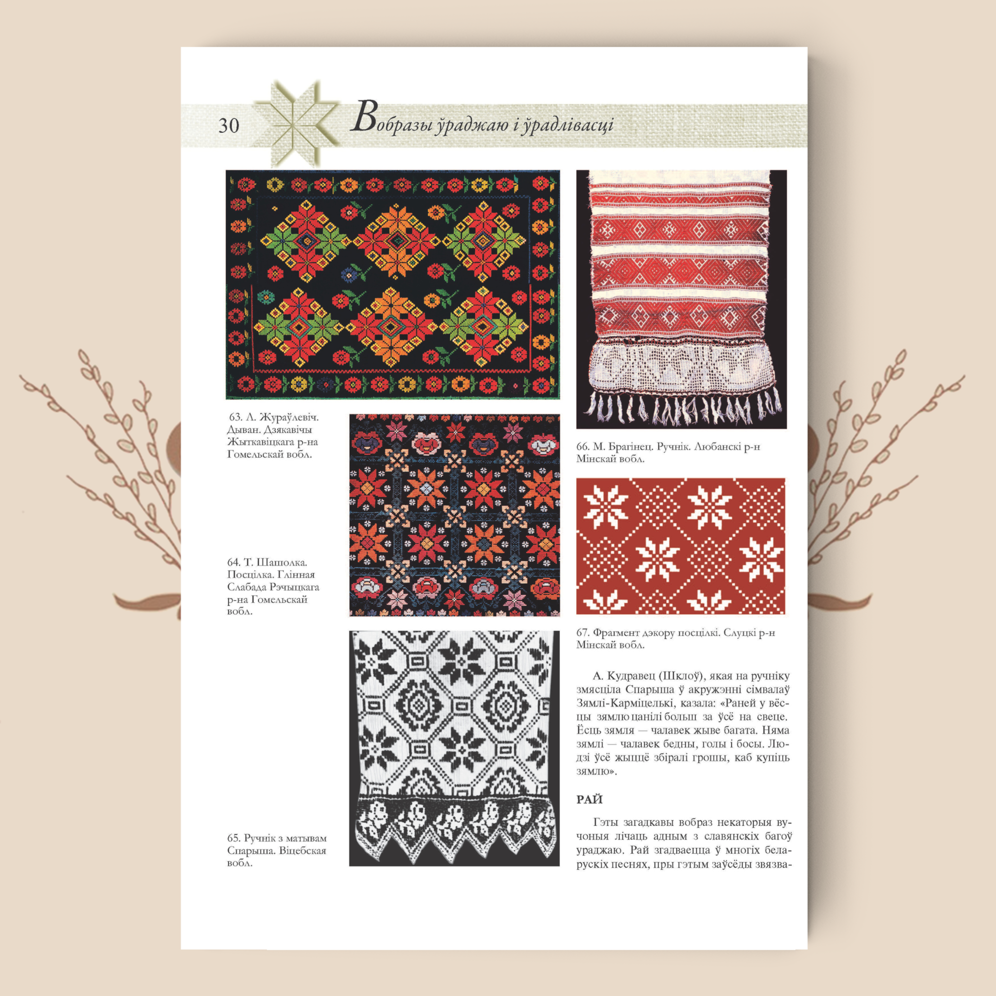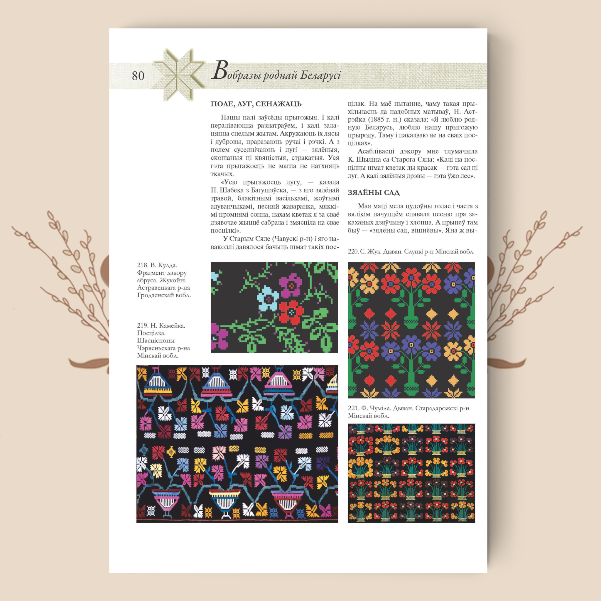 Эта книга – на белорусском языке, но иллюстрации в ней говорят сами за себя. Около 600 иллюстраций – чёрно‑белых и цветных фотоснимков и рисунков, собранных самим автором и его коллегами – наглядно показывают технику плетения и вышивки, детали белорусских орнаментальных мотивов.
