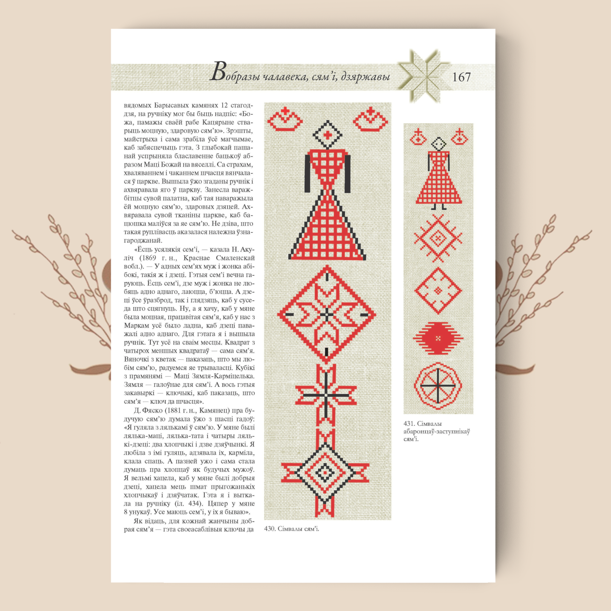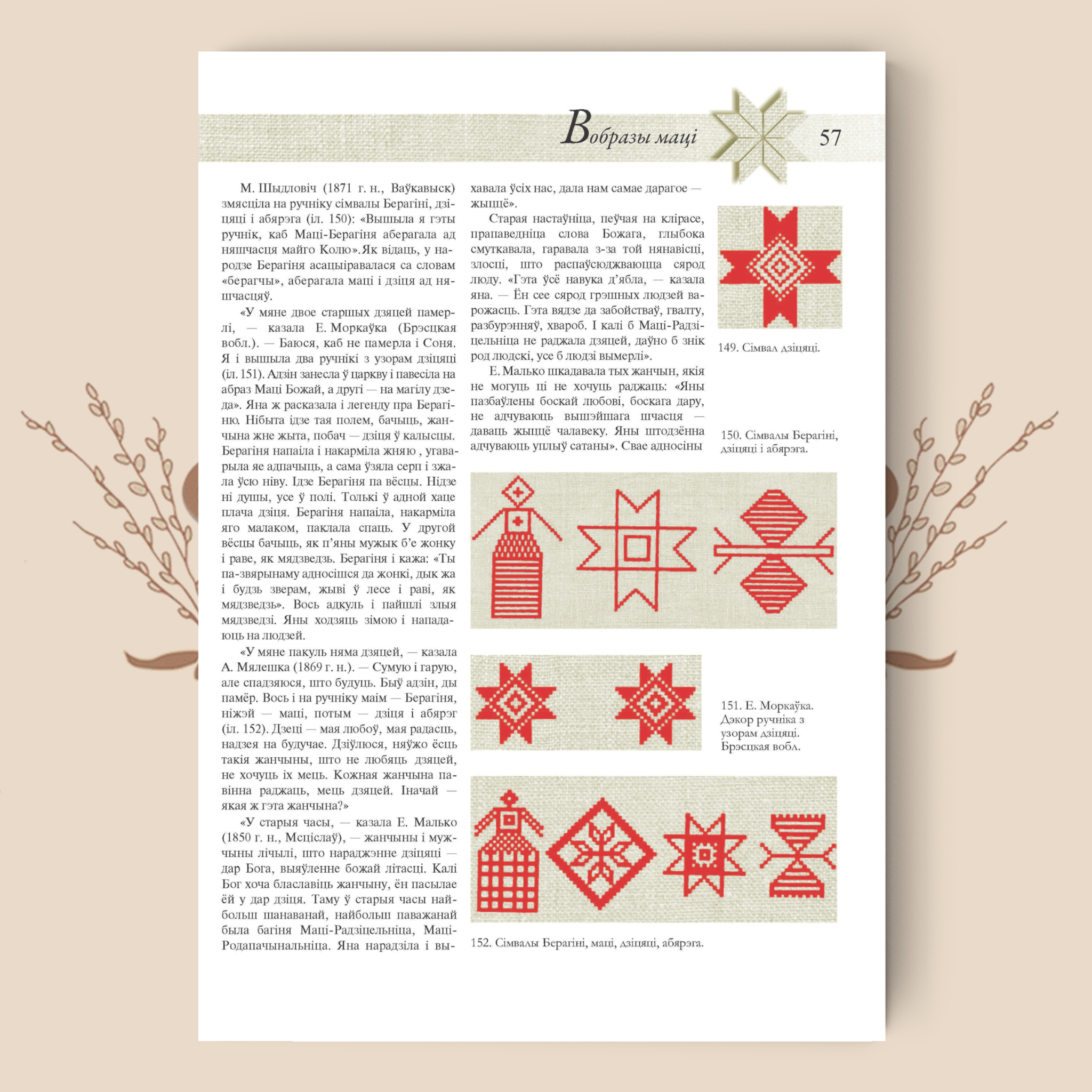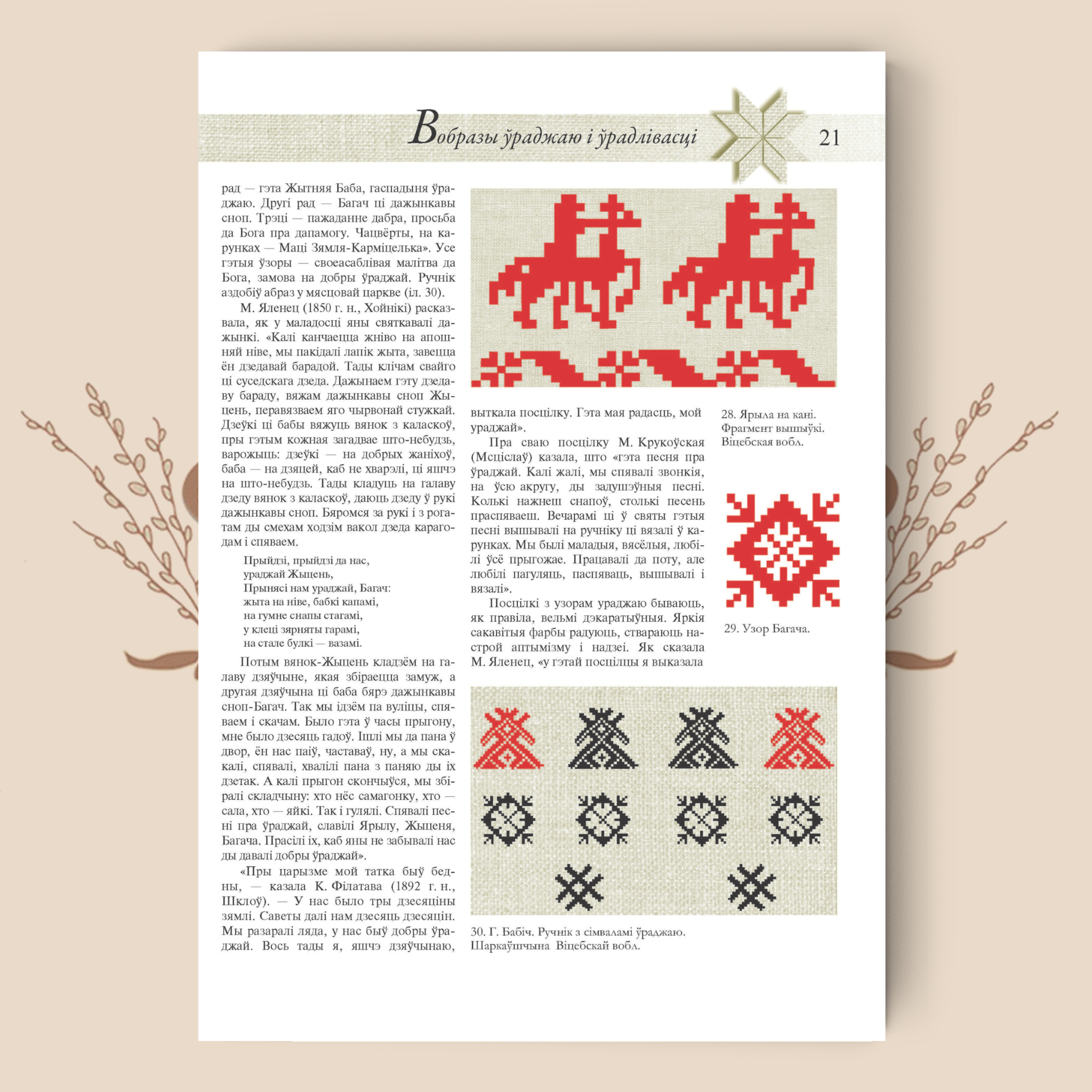 Эта книга – на белорусском языке, но иллюстрации в ней говорят сами за себя. Около 600 иллюстраций – чёрно‑белых и цветных фотоснимков и рисунков, собранных самим автором и его коллегами – наглядно показывают технику плетения и вышивки, детали белорусских орнаментальных мотивов.
