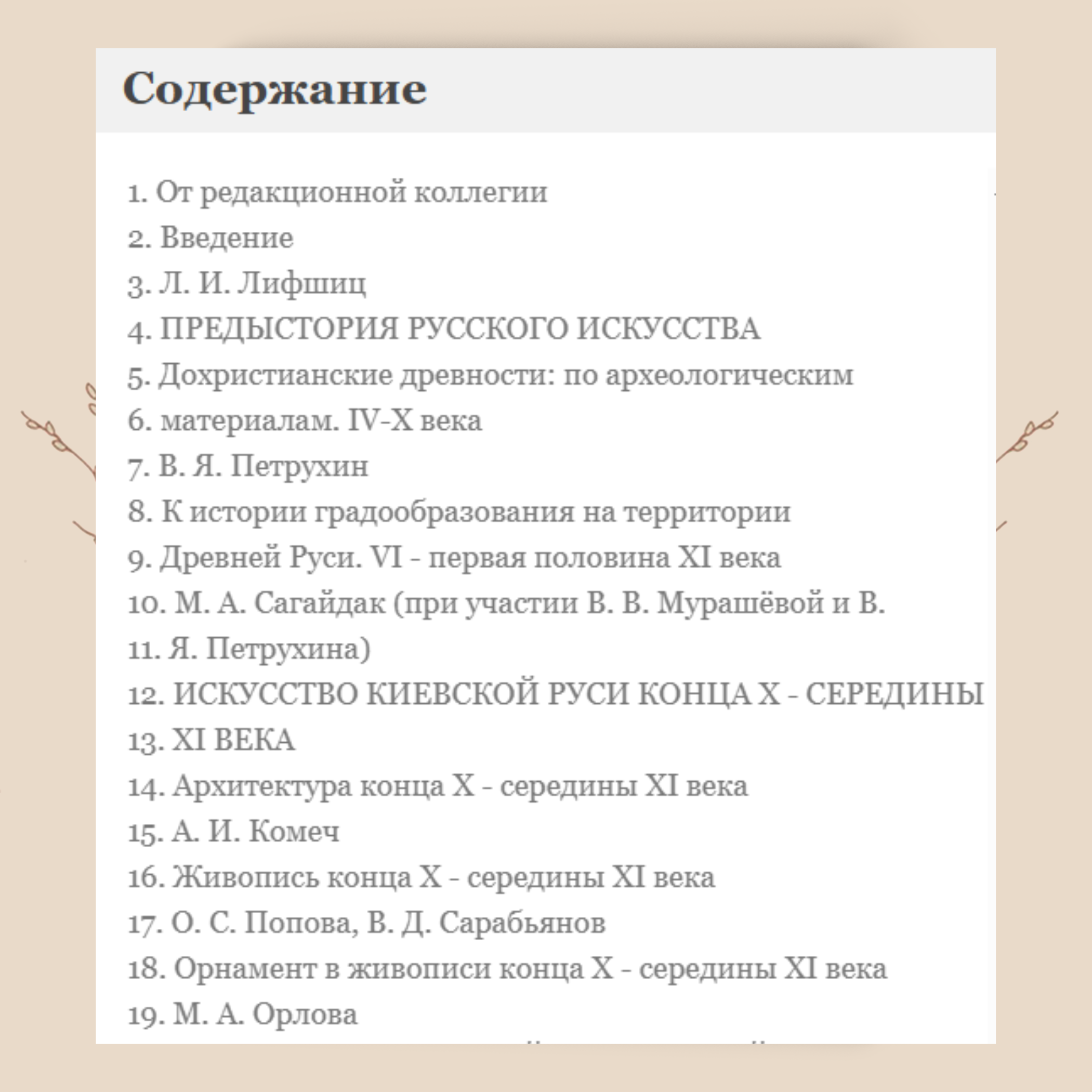 Настоящий том, открывающий "Историю русского искусства", является одновременно первым в серии из девяти томов, посвященных самому раннему ее периоду. Нижняя хронологическая граница этого периода приходится на VI в. - эпоху активного расселения славянских племен на территориях Восточной Европы, а верхняя совпадает с рубежом XVII- XVIII вв., началом правления Петра I и превращением Русского царства в Российскую империю. Древнейшая пора истории русской художественной культуры уже более двух с половиной столетий привлекает к себе внимание любителей отечественной старины, этнографов, филологов, археологов, историков Церкви и ее литургического обихода и, конечно, историков искусства.