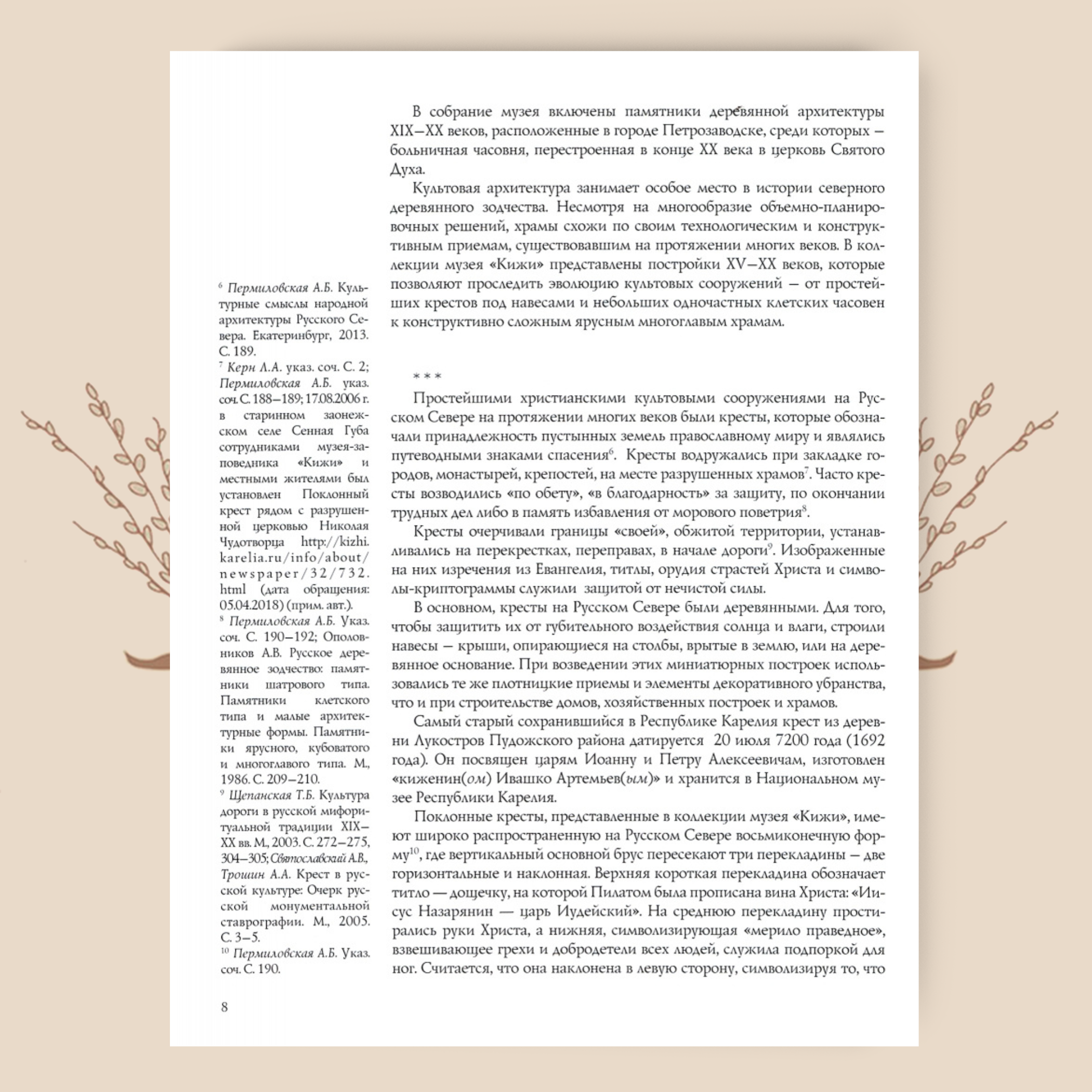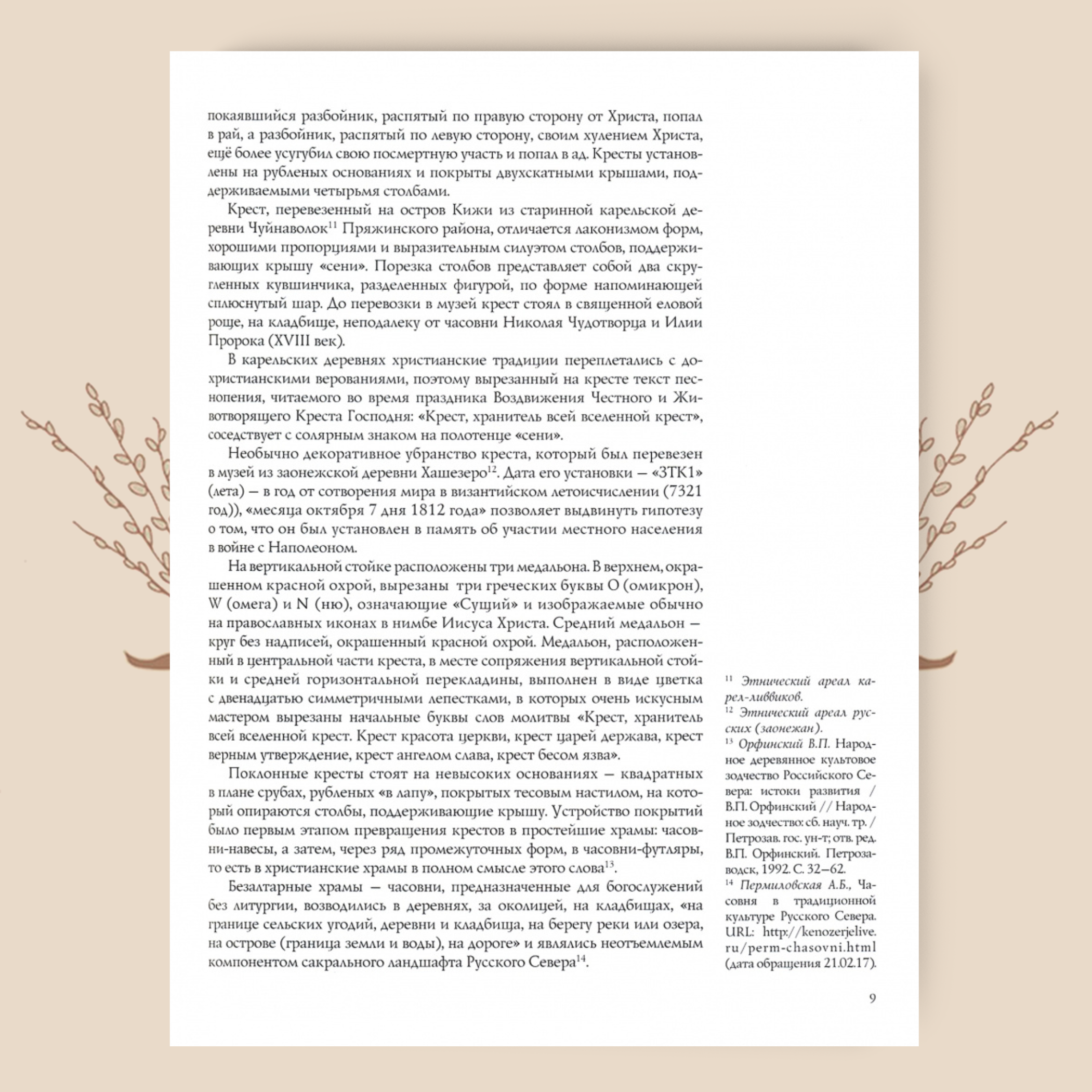 В подготовленном Маргаритой Кистерной и Александром Любимцевым "Каталоге памятников культовой архитектуры музея-заповедника "Кижи" приведено описание поклонных крестов, часовен и церквей, находящихся в оперативном управлении ФГБУК "Государственный историко-архитектурный и этнографический музей-заповедник "Кижи". Наиболее известными из них являются ансамбль Кижского погоста (XVII-XX вв.), включенный в Список объектов всемирного наследия ЮНЕСКО, и один из древнейших деревянных храмов России - церковь Воскрешения Лазаря из Муромского монастыря (XV век).