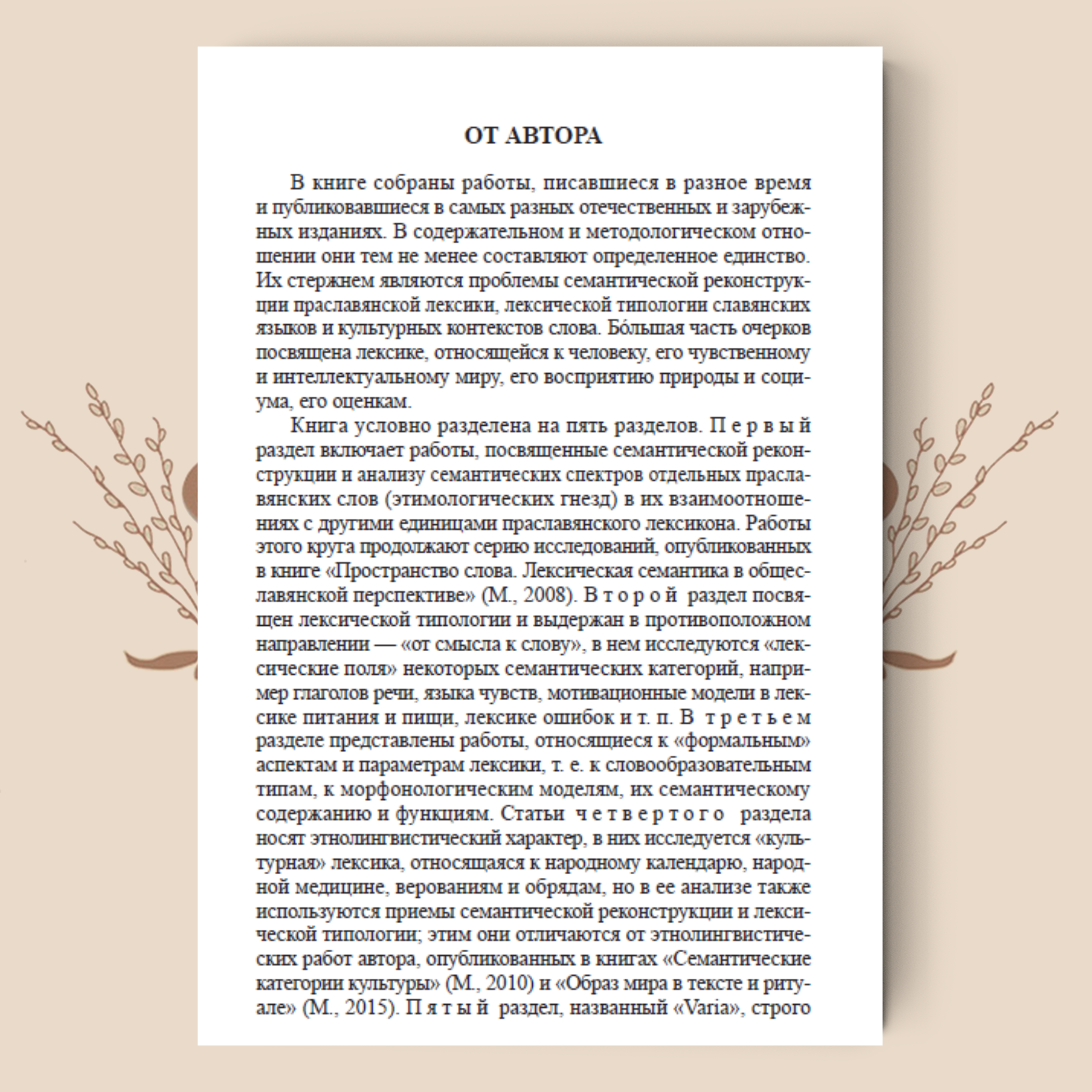 Книга представляет собой серию очерков, исследующих связь славянских языков и духовной культуры. Автор анализирует, как в лексике запечатлелись представления о человеке, его внутреннем мире и окружающей действительности.