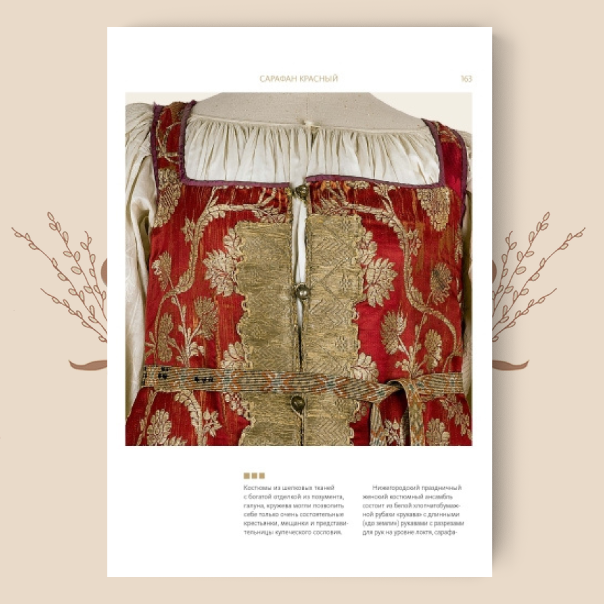 Также в альбоме вы найдете сведения об основных этапах изготовления домотканого материала, из которого шили сарафаны. О традиционных способах отбеливания и других приемах декорирования тканей. В приложении есть схемы кроя подлинных музейных образцов.