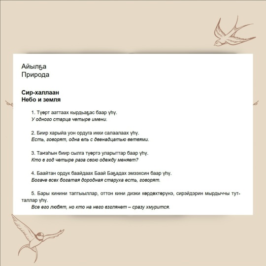 В сборнике содержатся загадки и ответы на них. Также есть параллельный перевод с якутского на русский язык.